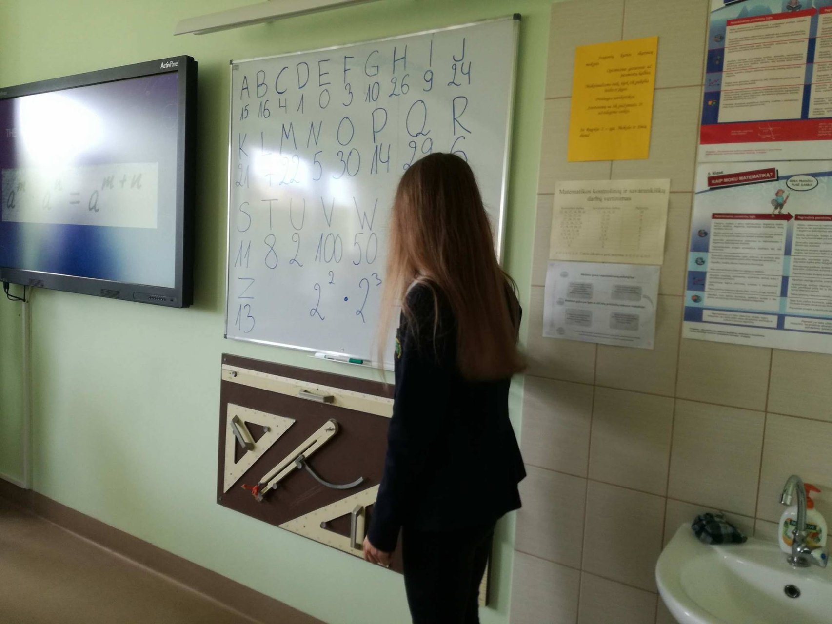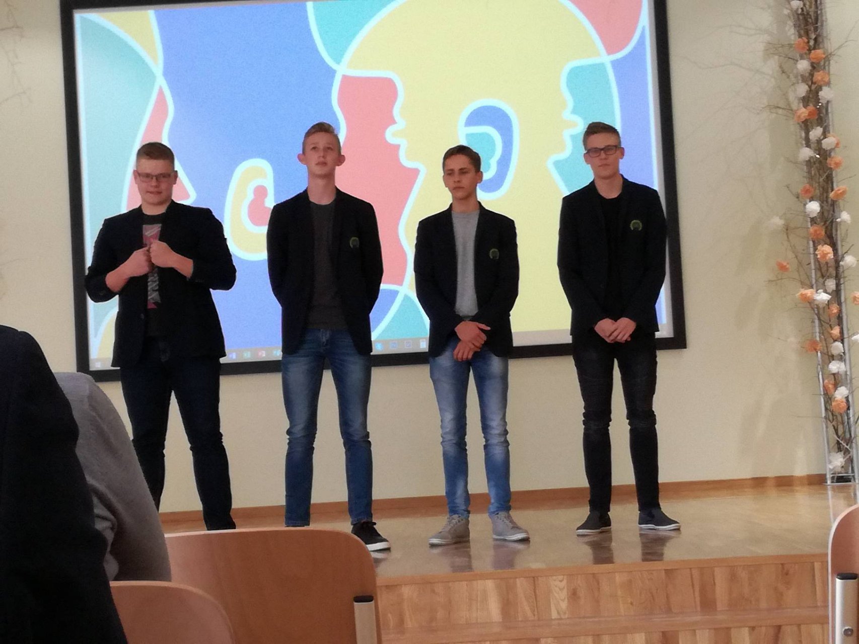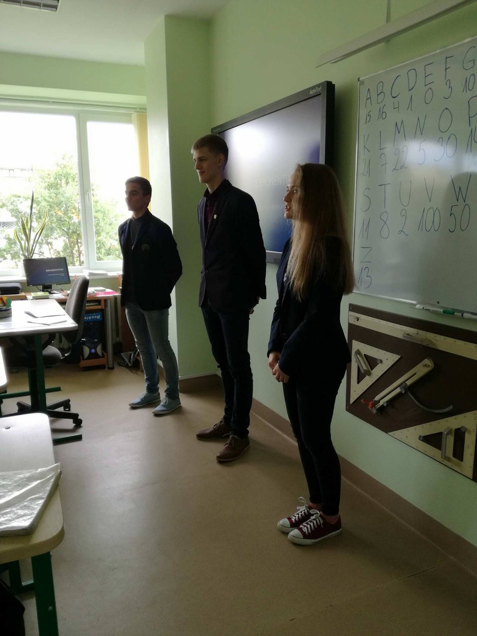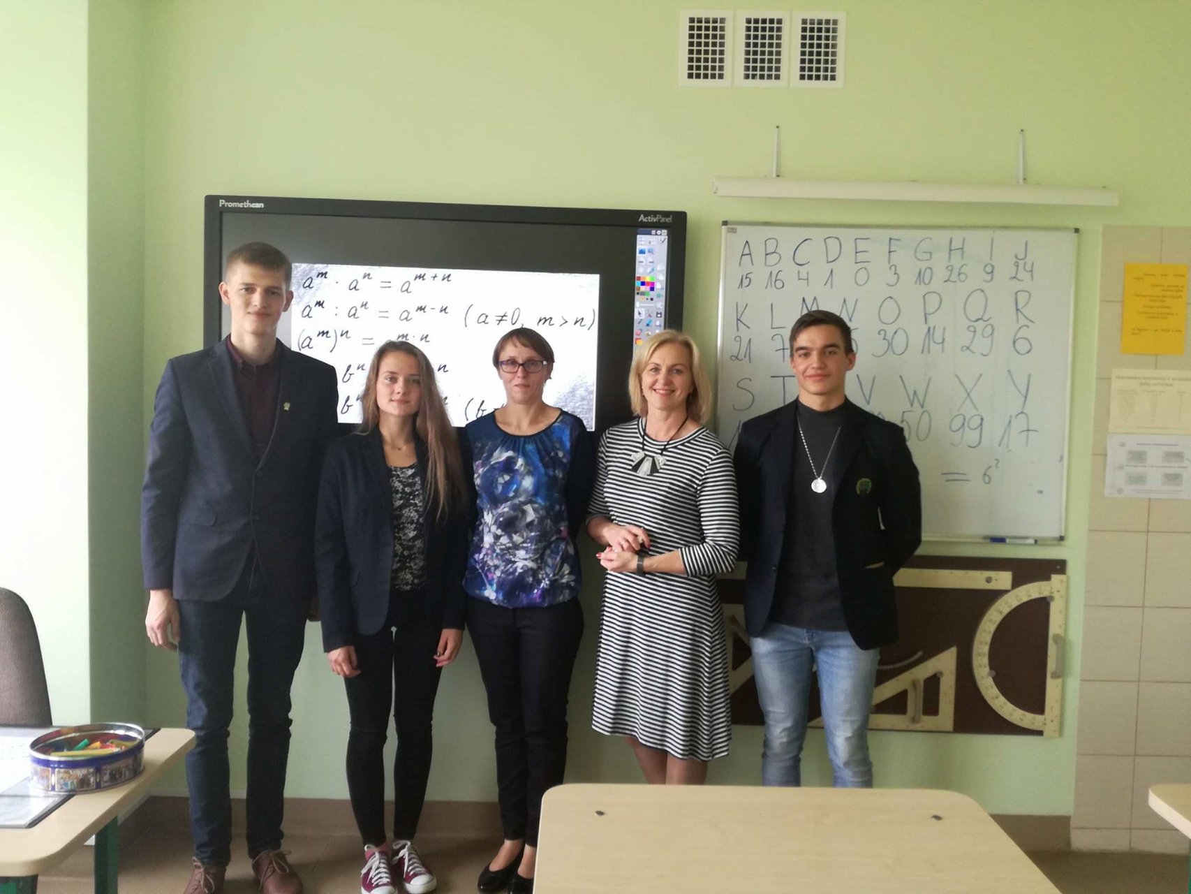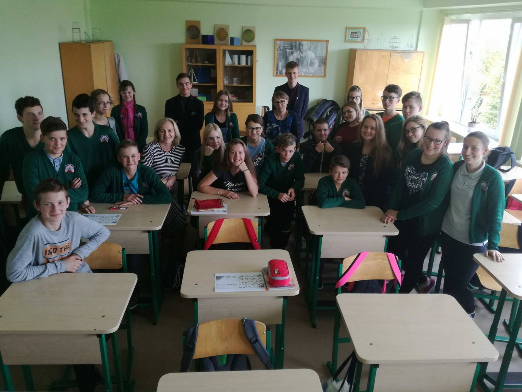Mūsų mokiniai ir toliau dalyvauja gimnazijos įgyvendinamame Erasmus+ tarpmokyklinės strateginės partnerystės projekte, todėl rugsėjo 20 dieną gimnazistai ne tik patys mokėsi, bet ir mokė kitus. Abiturientai Rytis Kacilevičius, Paulius Jankauskas ir trečiokė gimnazistė Greta Malinauskaitė kartu su mokytoja Aušra Vasilevičiūte keliavo į Pakruojo „Žemynos“ pagrindinę mokyklą. Ten aštuntos klasės mokiniams jie vedė netradicinę pamoką – matematikos vingrybių mokė bendraudami anglų kalba. Rytis K., Paulius J. ir Greta M. buvo paruošę įdomios medžiagos ir užduočių. Jie puikiai išaiškino temą, rodė įvairių pavyzdžių ir padėjo spręsti užduotis, gimnazistams talkino „Žemynos“ pagrindinės mokyklos matematikos mokytoja Silva Kairienė. Pirmieji teisingai išsprendę mokiniai buvo net apdovanoti saldžiaisiais prizais. Pamokos pabaigoje visi aštuntokai džiaugėsi ir nuoširdžiai plojo jauniesiems mokytojams.