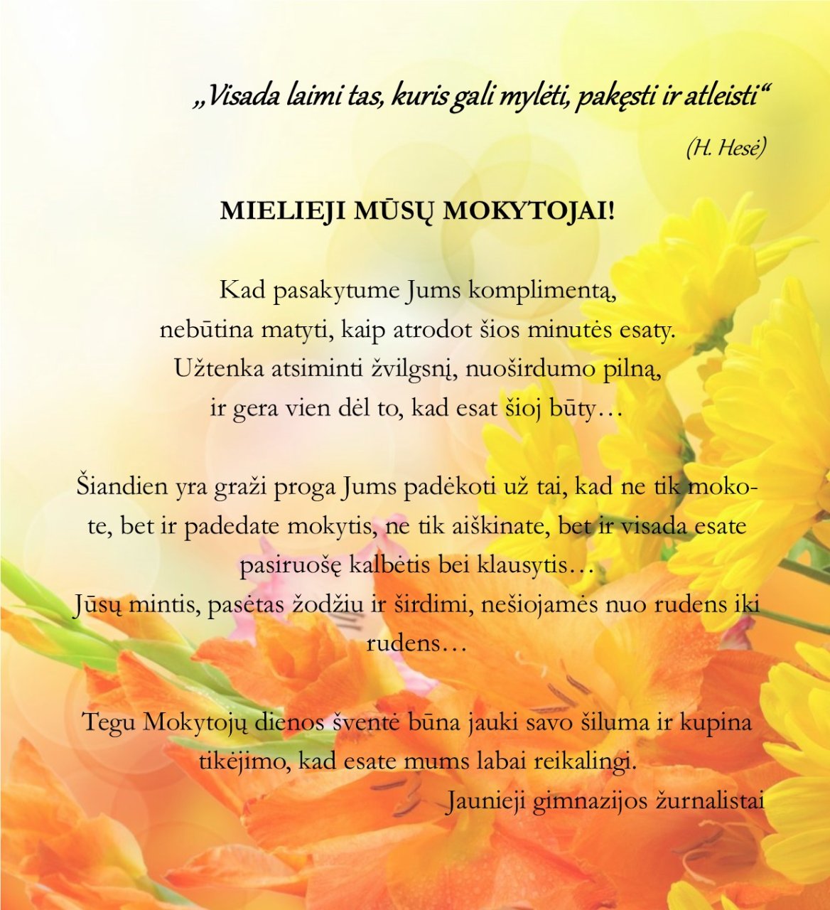 Ši šventė praėjo nepastebimai greitai ir liko dar vienas gražus, šiltas, jaukus prisiminimas, kuris mus visada primins, kad reikia mokytis kitų kalbų, bet už viską pasaulyje labiausiai būtina mylėti ir saugoti savo gimtąją kalbą. Anot Justino Marcinkevičiaus, juk ji iš motinos lūpų išdygo ir mumyse pasisėjo...