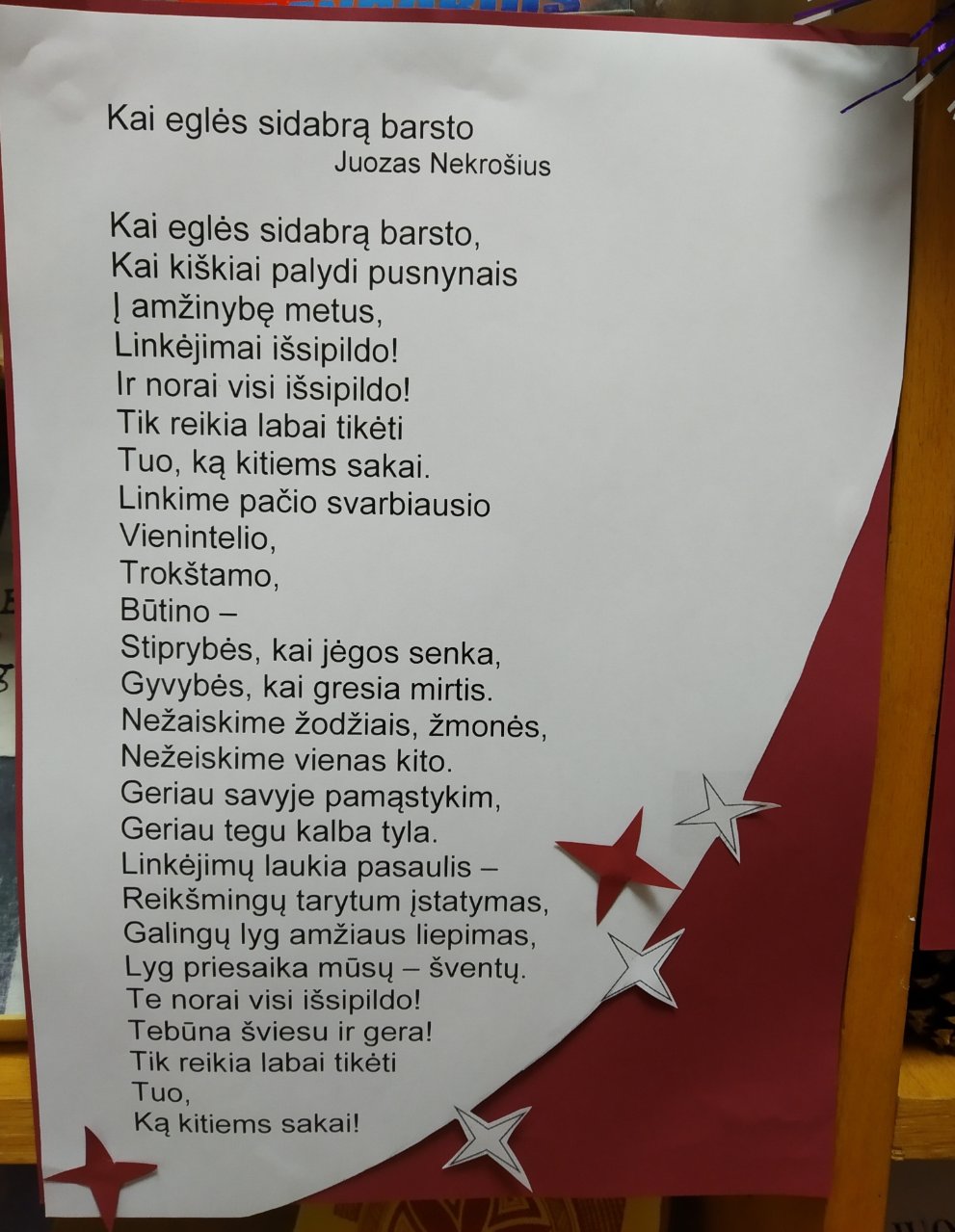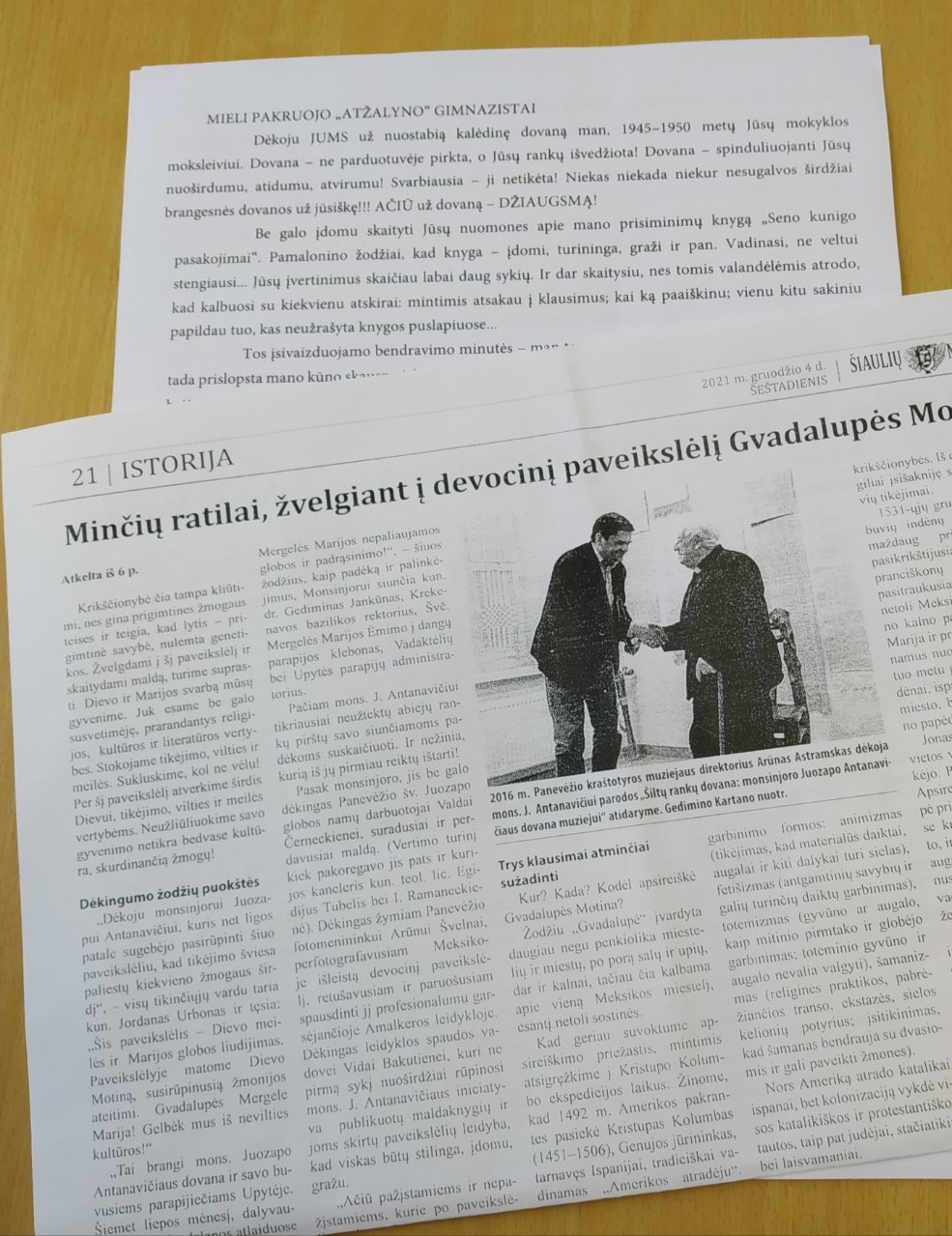 Gruodžio 15 dieną gimnazijos bibliotekoje vyko tikybos pamokos kitaip. I klasių mokiniai susipažino su buvusio gimnazijos mokinio, monsinjoro Juozapo Antanavičiaus knyga „Senojo kunigo pasakojimai“. Bibliotekininkė paskaitė knygos ištraukų, tikybos mokytoja Laimutė Činčienė pasidalijo prisiminimais apie kunigą ir pakvietė mokinius parašyti laiškus – linkėjimus monsinjorui, kuris 2021 metais šventė 90 metų jubiliejų (kunigas gimė 1931-04-18 Pašvitinyje Pakruojo rajone).
