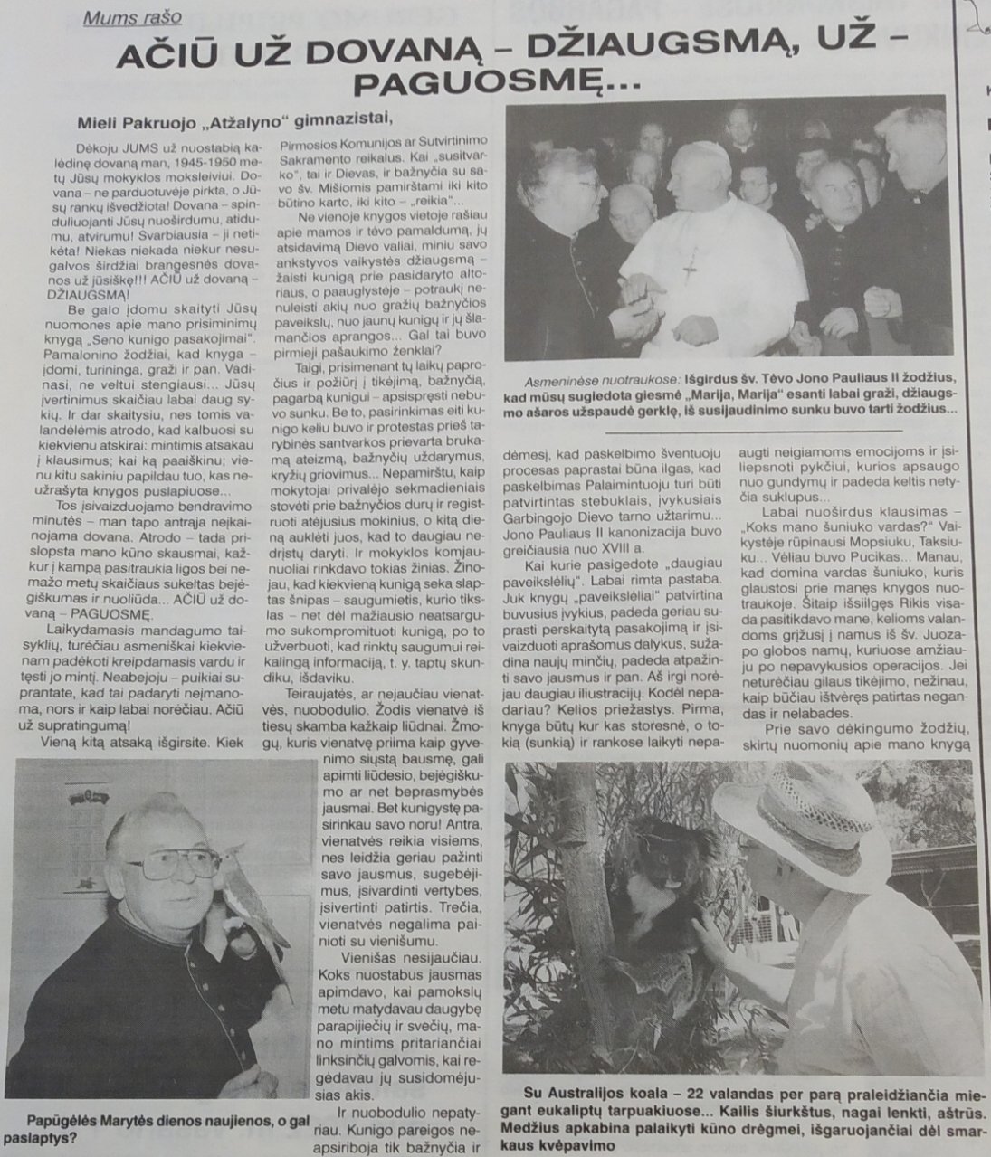 Laiškai buvo Kalėdų dovana, netikėta, bet sušildžiusi širdį, monsinjoras visus laiškus perskaitė pats, atsakymams parašyti nebeužtenka jėgų. Kūrybingas dvasininkas nenuleido rankų ir padėkojo Pakruojo rajono laikraštyje „Auksinė varpa“. Nuoširdžius monsinjoro žodžius užrašė knygos „Seno kunigo pasakojimai“ redaktorė dr. Irena Ramaneckienė. Didžiulė pagarba monsinjorui ir docentei dr. Irenai Ramaneckienei, kurie yra pavyzdžiai mums visiems, kad žodis turi didelę galią.