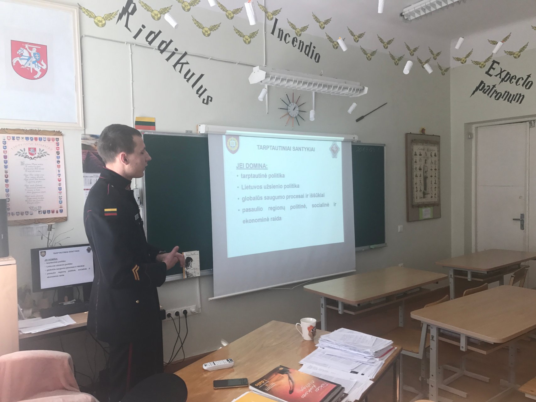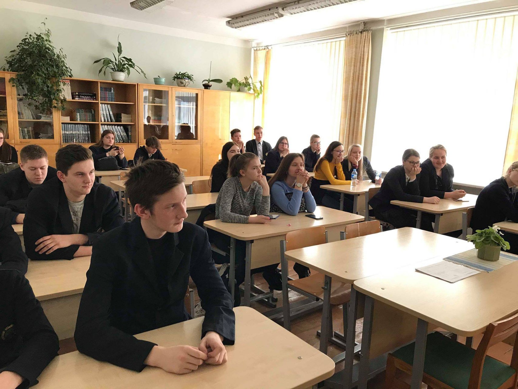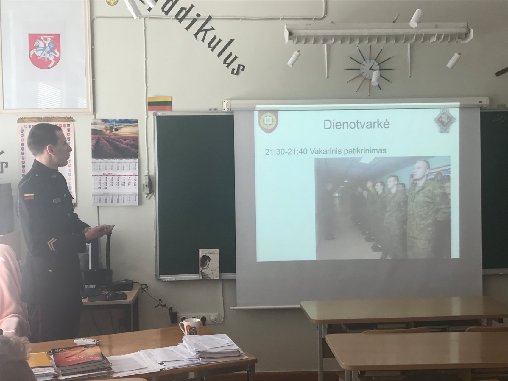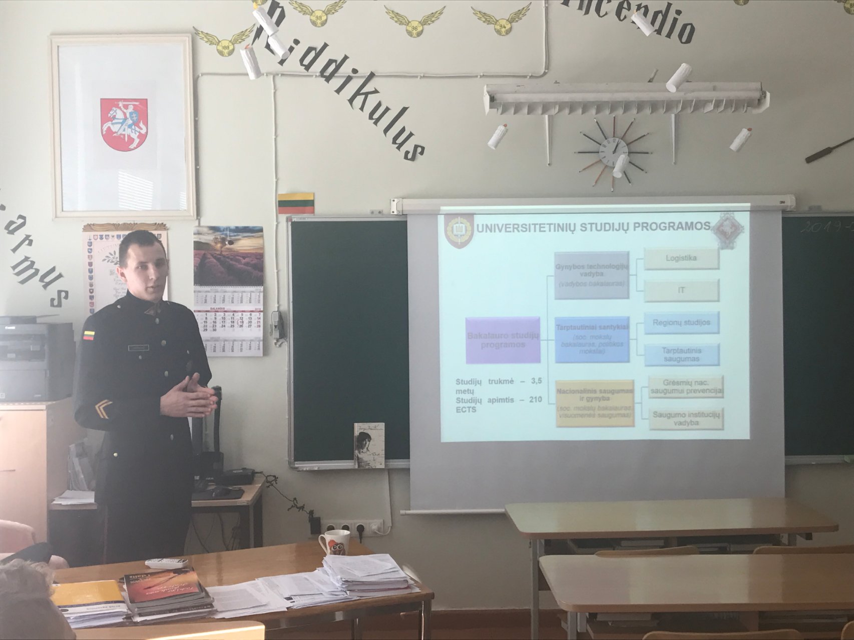 Į gimnaziją susitikti su mokiniais prieš pat pavasario atostogas atvyko buvęs mūsų gimnazistas Eligijus Bagdonas, kuris yra Generolo Jono Žemaičio Lietuvos karo akademijos II kurso Tarptautinių santykių studijų programos kariūnas. Vaikinas pagal Erasmus+ studijų mainų programą neseniai studijavo Austrijos Teresės karo akademijoje. Eligijus mielai pasidalijo įspūdžiais, kaip sekėsi svečioje šalyje įgyti tiek bendrųjų, tiek profesinių žinių. Be to, gimnazistai buvo supažindinti su priėmimo taisyklėmis ir atranka į Lietuvos karo akademiją, kariūnų dienotvarke ir mokslais, papasakota apie puolimo ir gynybos operacijas, ilgus žygio maršrutus ir kitus iššūkius, kuriuos tenka įveikti, pratybas. Kalbėta ir apie karininko profesijos galimybes. Beje, turiningas gali būti ir laisvalaikis, pavyzdžiui, Eligijus dainuoja chore „Kariūnas“ ir vyko į Estiją, kur dalyvavo Europos studentų chorų festivalyje. Gimnazistai buvusiam mūsų mokiniui uždavė daug įdomių klausimų, vyko nuoširdus ir mielas pašnekesys.