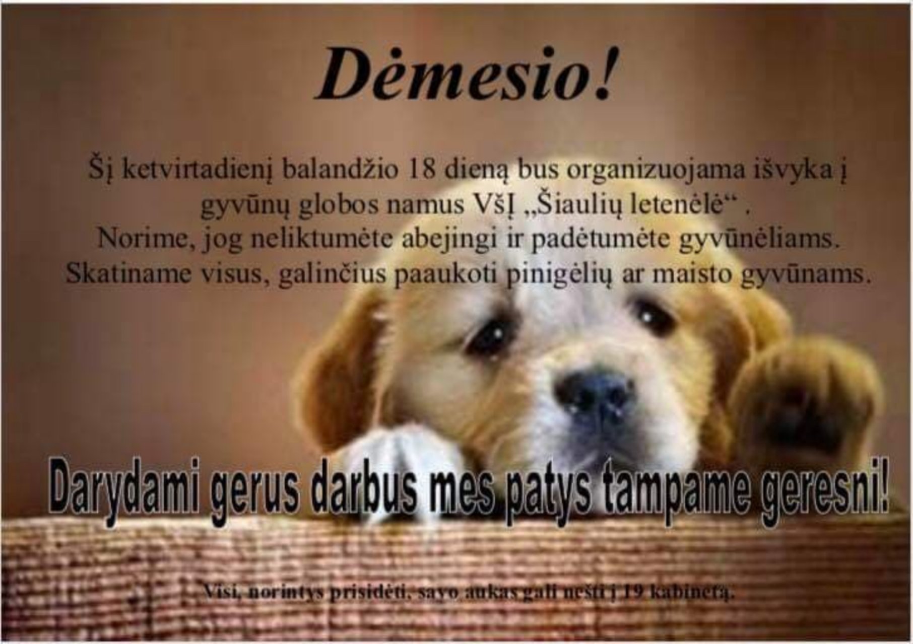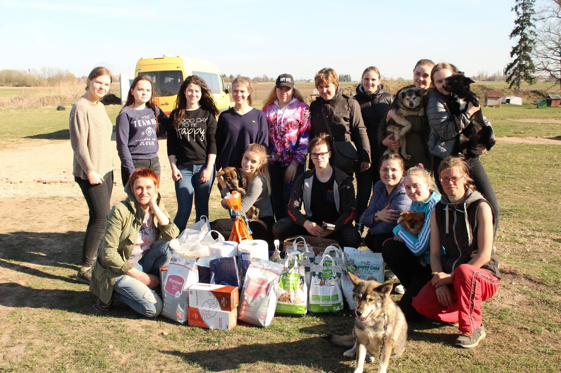 Balandžio 18 dieną, po 7 pamokų, IIIc klasės gimnazistai Airidas Sirusas, Matas Michnevičius, Monika Martinaitytė, Austėja Vazgytė, Greta Štarevičiūtė, Dominyka Bajoriūnaitė, Gabija Jareckaitė, Vaida Krivoščenkaitė ir Gabija Petrauskaitė bei kitų klasių mokinės Skirmantė Livanaitė, Arūnė Sabeckaitė, Žaneta Vaidžiulytė, Ligita Padirvinskaitė ir Andželika Adomaitytė su mokytoja Rita Vinskūnaite išskubėjo į gyvūnų globos namus. Pakeliui už paaukotus pinigus buvo nupirkta maisto bei kitų reikalingų dalykų gyvūnėliams. Nuvykę pamatėme apie šimtą įvairių gyvūnėlių: šunų, kačių, ožkų ir viena avis. Mokiniai vedžiojo šunis, juos glostė bei šukavo, džiaugėsi galėdami padėti. Jau ruošiantis namo kai kurių gimnazistų akyse pasirodė ašaros – buvo labai gaila palikti gyvūnėlius.