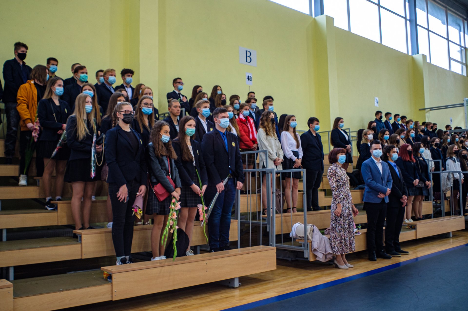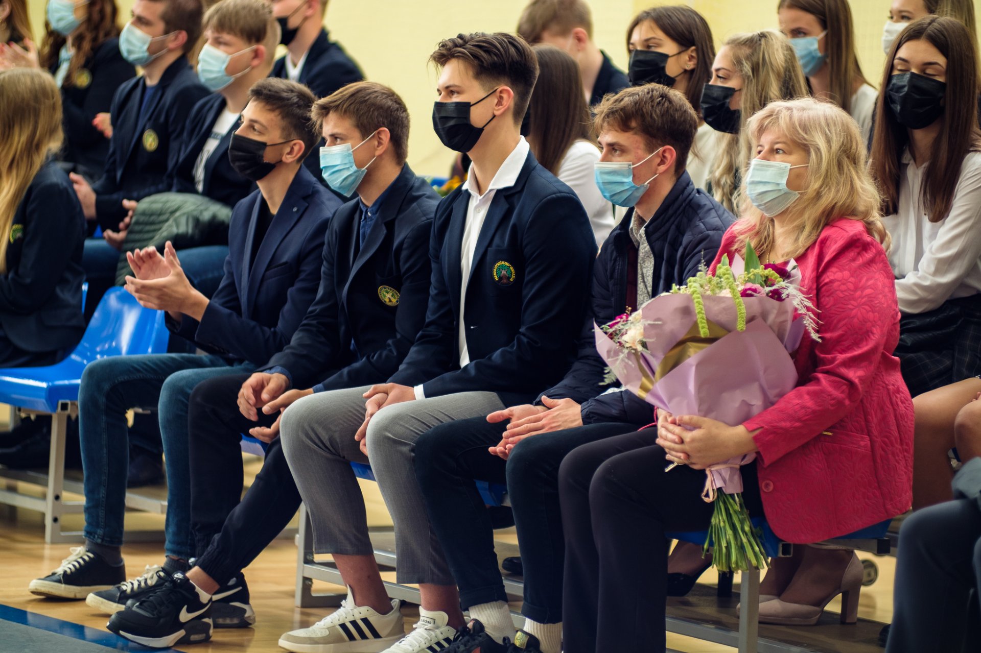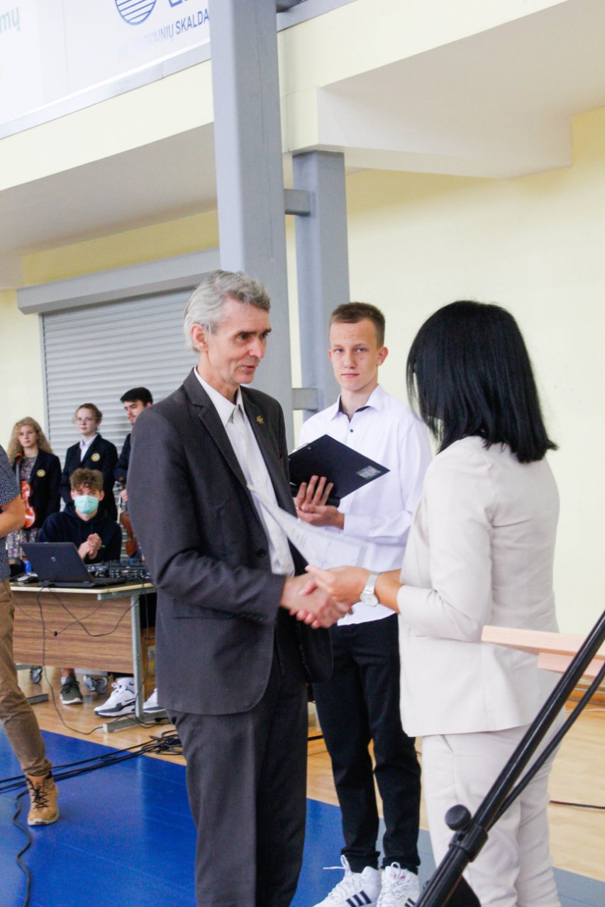 Po to visi skubėjo į gimnaziją, prie kurios trečiokai pasitiko oriai žengiančius abiturientus su auklėtojomis. Sporto salėje šurmuliavo gimnazijos bendruomenė, atvyko svečių. Viltingai skambėjo ketvirtokės Beatos Vaitiekūnaitės skambi daina. Renginį vedė antrokai. Džiugu, kad šventinis rytas buvo kupinas tikro susitikimo džiaugsmo. Pakruojo „Atžalyno“ gimnazijos direktorė Asta Valuntienė visus pasveikino mokslo metų pradžios proga ir pakvietė būti kartu, matyti, jausti, puoselėti žmogiškąsias vertybes. Abiturientams ji linkėjo didelių ambicijų, siekiant geresnių rezultatų, pirmokams gimnazistams - sėkmingos adaptacijos, visiems - tvirto starto! Veržliai skambėjo direktorės žodžiai apie susitarimais pagrįstą saugią bendruomenę, kurią kuriame visi kartu. Direktorė IV a klasės mokiniui Joriui Vaicekauskui įteikė Lietuvos Respublikos švietimo, mokslo ir sporto ministerijos II laipsnio diplomą ir užkabino medalį. Vaikinas 2020-2021 m. m. dalyvavo Lietuvos mokinių technologijų olimpiadoje „Kūrybinis virusas“ ir užėmė prizinę vietą statybos ir medžio apdirbimo veiklos 11-12 klasių grupėje. Gimnazistui pasiruošti padėjo technologijų mokytojas Egidijus Impolis. Taip pat praeitais mokslo metais Eglė Urbonaitė ir Fausta Šneideraitytė, II b klasės gimnazistės, ir III b klasės mokinė Vanesa Juzeliūnaitė dalyvavo respublikiniame konkurse „Lietuvos kovų už laisvę ir netekčių istorija“. Merginos išsiuntė piešinius (darbų tematika – Lietuva sovietų okupacijos metais, trėmimai). Gimnazistėms įteiktos padėkos. Mokines konsultavo istorijos mokytoja Gražina Kairiūkštienė. Be to, direktoriaus pavaduotojos ugdymui Rasa Augustinaitienė ir Rasa Bertulienė įteikė gimnazistams padėkos raštus už labai gerą mokymąsi, dalyvavimą įvairiuose konkursuose ir įvairiose kitose veiklose 2020-2021 m. m. Direktoriaus pavaduotoja ugdymui Rasa Augustinaitienė palinkėjo naujų idėjų ir jų įgyvendinimo naujais mokslo metais.