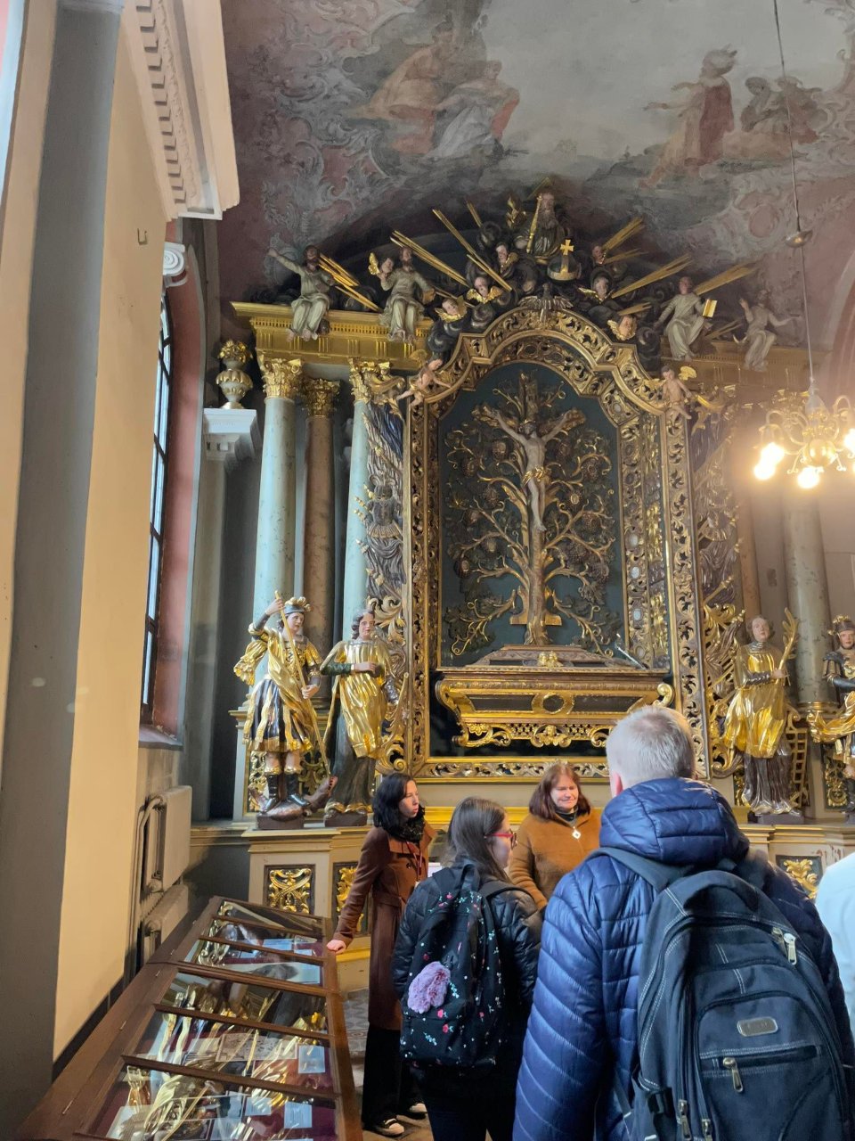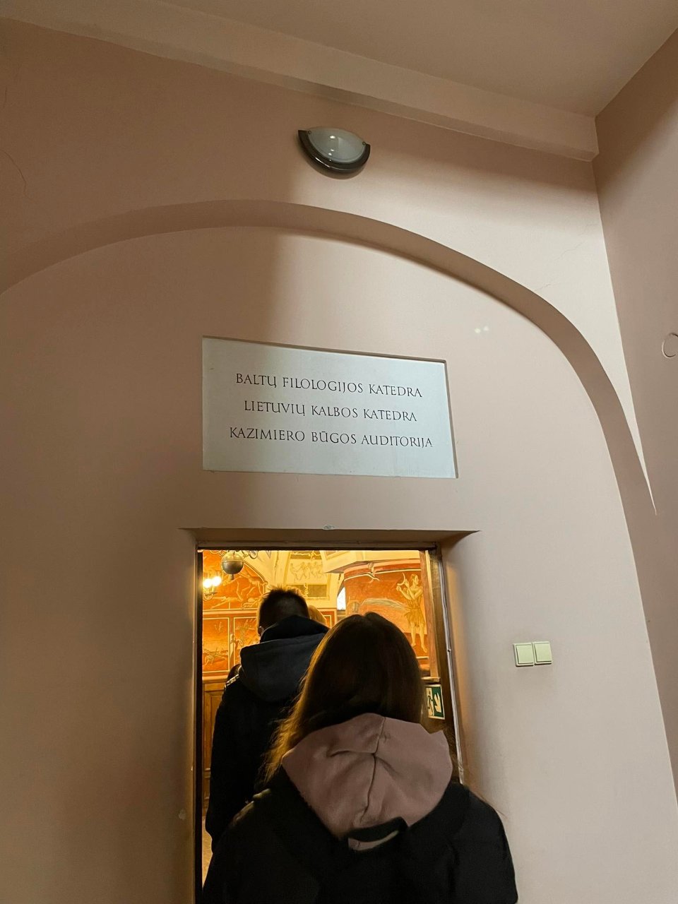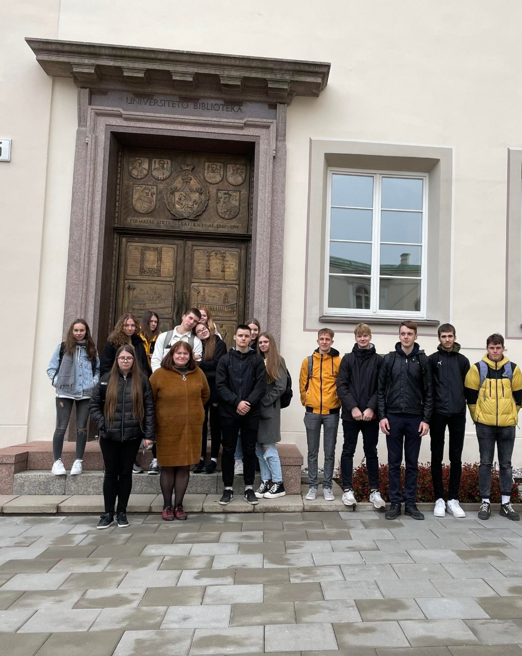 Spalio 13 dieną grupelė trečiokų gimnazistų ir viena abiturientė su lietuvių kalbos ir literatūros mokytoja Valda Jukniene vyko į Vilnių. Pirmiausia apsilankėme Vilniaus universitete, įkurtame 1579 m., viename seniausių ir žymiausių Vidurio ir Rytų Europos aukštųjų mokyklų. Ateinančiais metais, balandžio 1-ąją, VU švęs 444 metų jubiliejų. Vaikščiojome po įvairius universiteto kiemelius, pavadintus rašytojų vardais. Kiemeliuose yra daug jų simbolikos, kuri padeda kūrėjus atpažinti. Užėjome ir į universiteto vidų, kur susipažinome su įvairių laikotarpių menininkų nutapytomis freskomis. Po to užsukome į universiteto teritorijoje esančią Šv. Jono Krikštytojo ir Šv. Jono apaštalo ir evangelisto bažnyčią. Joje pamatėme daug paminklų, skirtų rašytojams Adomui Mickevičiui, Simonui Daukantui ir kt. Sužavėjo bažnyčios vargonai, kurie yra patys didžiausi Lietuvoje. O zakristijoje matėme eksponuojamą M. Daukšos išverstos „Postilės“ knygą.