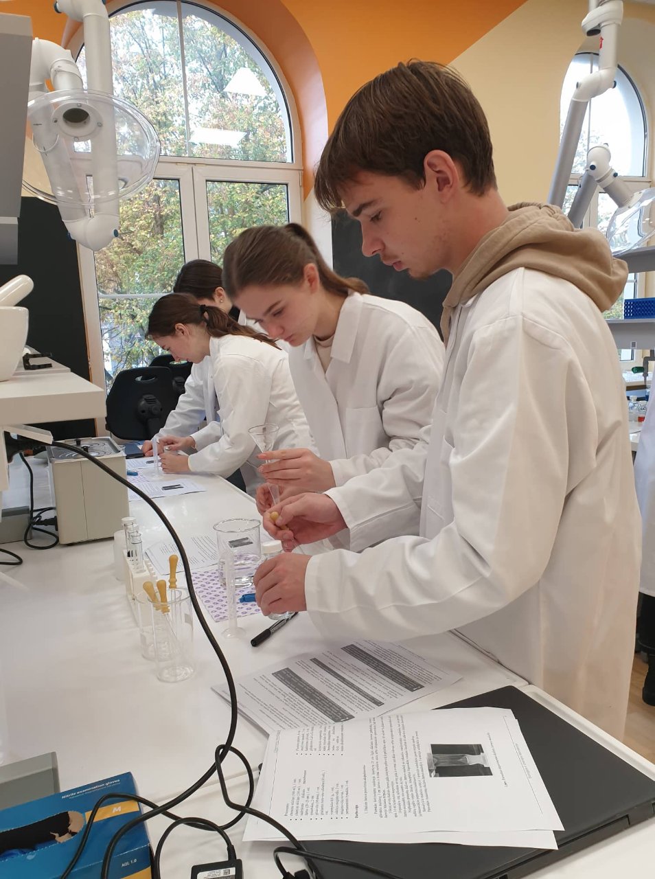 Spalio 17 d. abiturientų grupelė, viena trečiokė gimnazistė ir biologijos mokytoja Daiva Makauskienė lankėsi VU Šiaulių akademijos STEAM centre, kur biologijos chemijos laboratorijoje atliko tiriamąjį darbą „Cheminių medžiagų kelionės ląstelėje“.