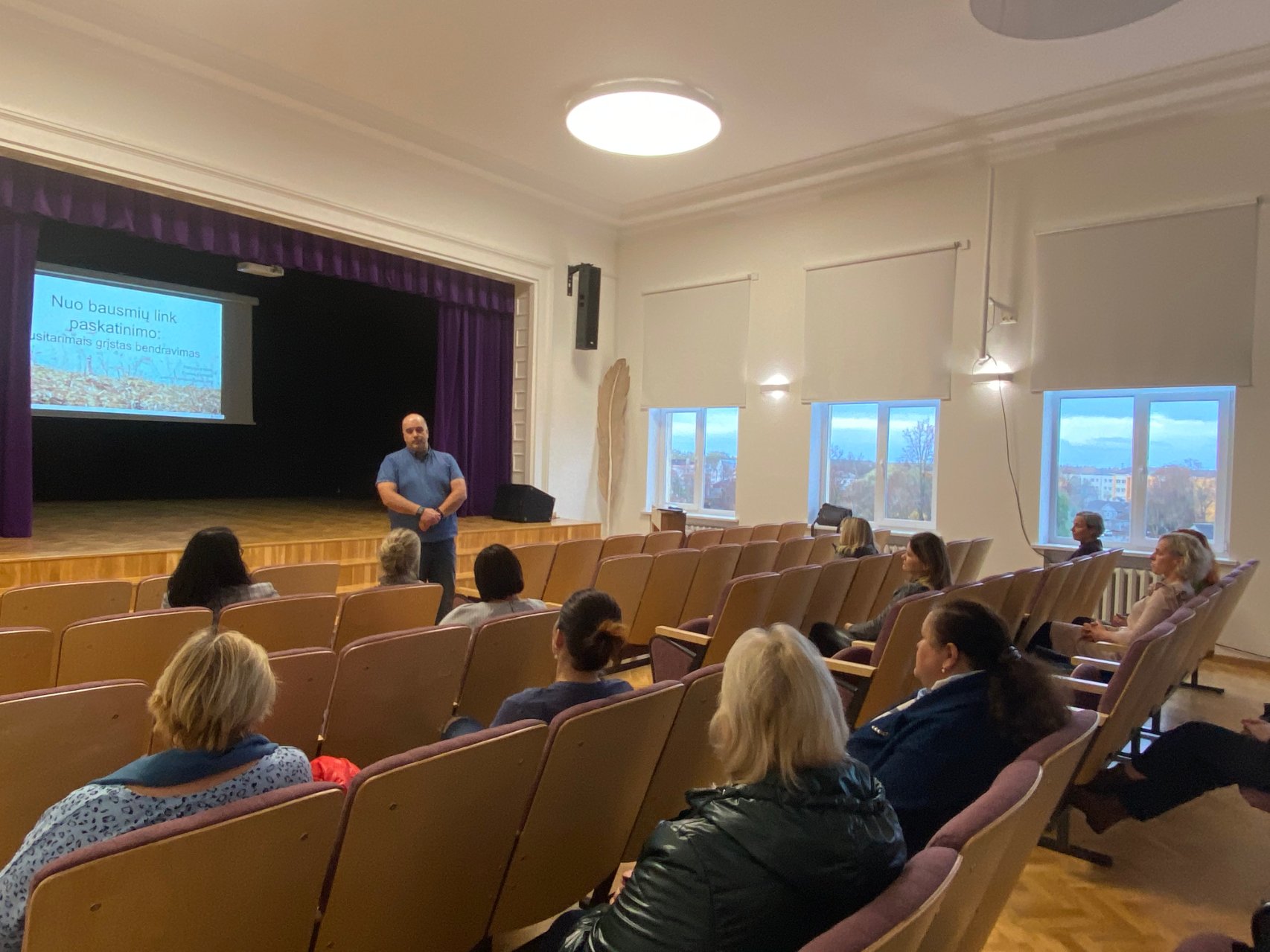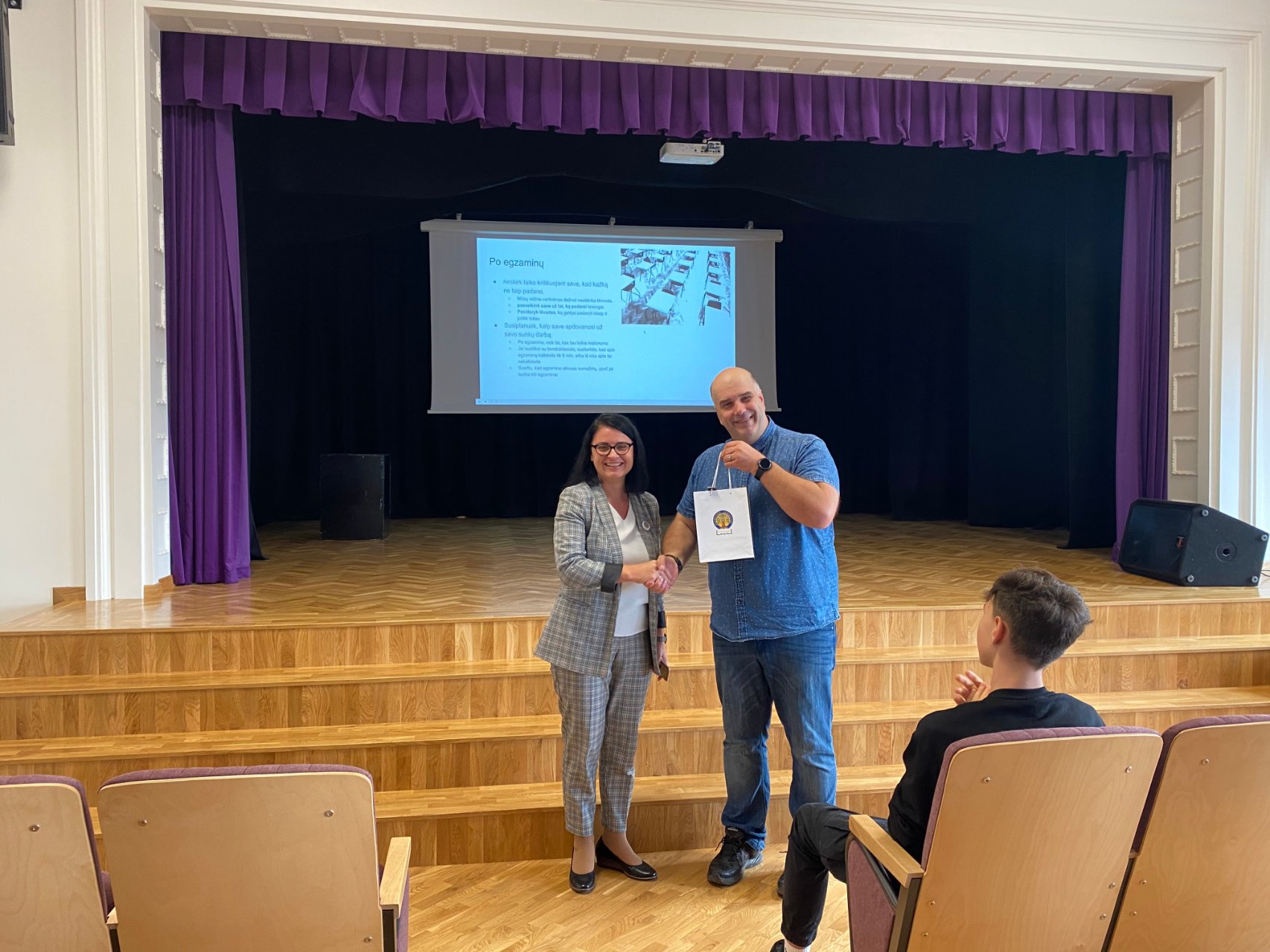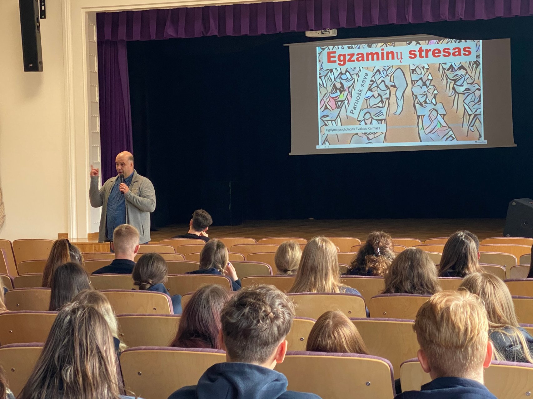Spalio 18 d. į gimnaziją atvyko psichologas Evaldas Karmaza, kuris susitiko su abiturientais ir pasidalijo savo įžvalgomis, kaip lengviau įveikti egzaminų stresą. Mūsų ketvirtokai išgirdo naudingų patarimų, kuriuos, tikimės, pritaikys ir lengviau įveiks nerimą. Vakare gimnazijos aktų salėje svečias bendravo su gimnazistų tėveliais, kurie klausė psichologo paskaitos „Nuo bausmių paskatinimo link: susitarimais grįstas bendravimas“. Evaldas Karmaza pateikė puikių patarimų, kaip kurti namuose taisykles, kad būtų išvengta barnių, aptarė susitarimų nesilaikymo pasekmes. Nuoširdžiai dėkojame Pakruojo visuomenės sveikatos centrui už galimybę dalyvauti svečio paskaitose, o psichologui už aktualių temų informatyvų ir aiškų pateikimą.