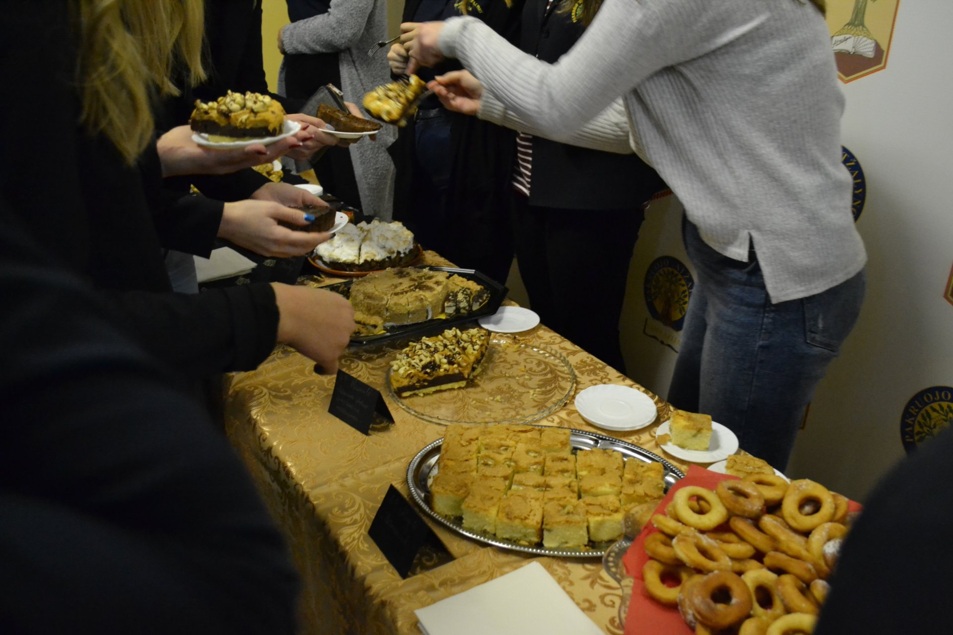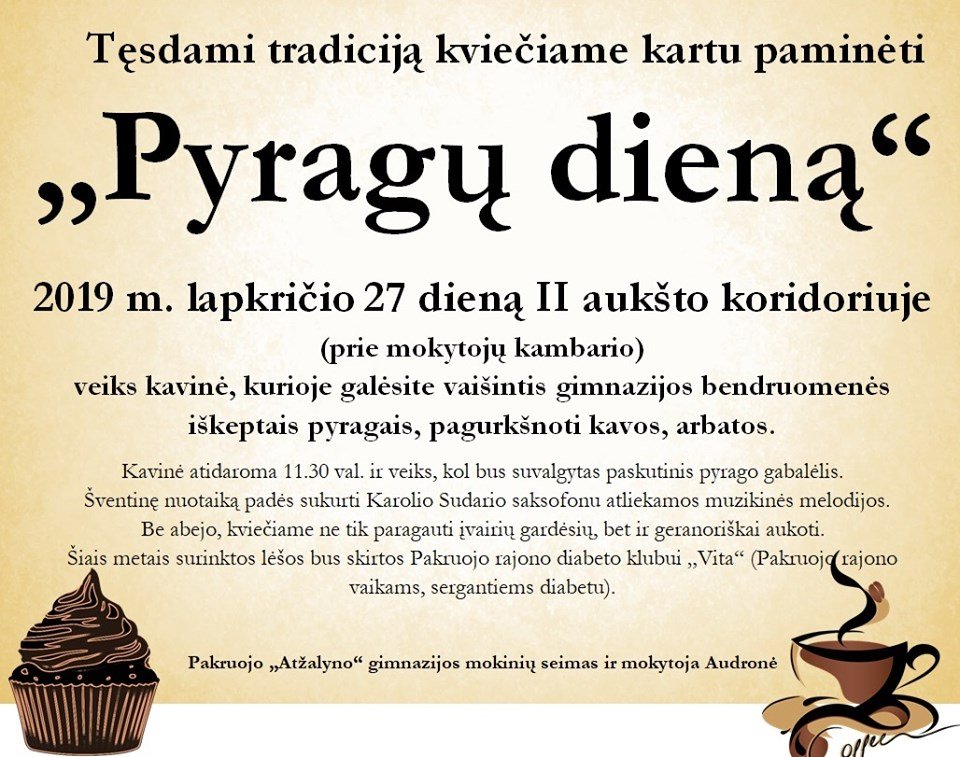 2019 m. lapkričio 27 dieną tęsdami tradiciją kvietėme visus paminėti „Pyragų dieną“. Po 4 pamokų pedagogai ir gimnazistai skubėjo į II aukštą, kur prie mokytojų kambario teatralizuotoje kavinėje buvo galima vaišintis gimnazijos bendruomenės iškeptais pyragais, pagurkšnoti kavos, arbatos. Skambėjo abituriento Karolio Sudario saksofonu atliekamos muzikinės melodijos Be abejo, kvietėme geranoriškai aukoti pinigėlių. Šiais metais surinkta 211 eurų, kurie skiriami Pakruojo rajono diabeto klubui „Vita“. Nuoširdžiai tariame ačiū visai bendruomenei už gebėjimą pasidalyti gerumu, o jis juk nemarus: tegu atgimsta kiekvienam iš jūsų vis kita išraiška.