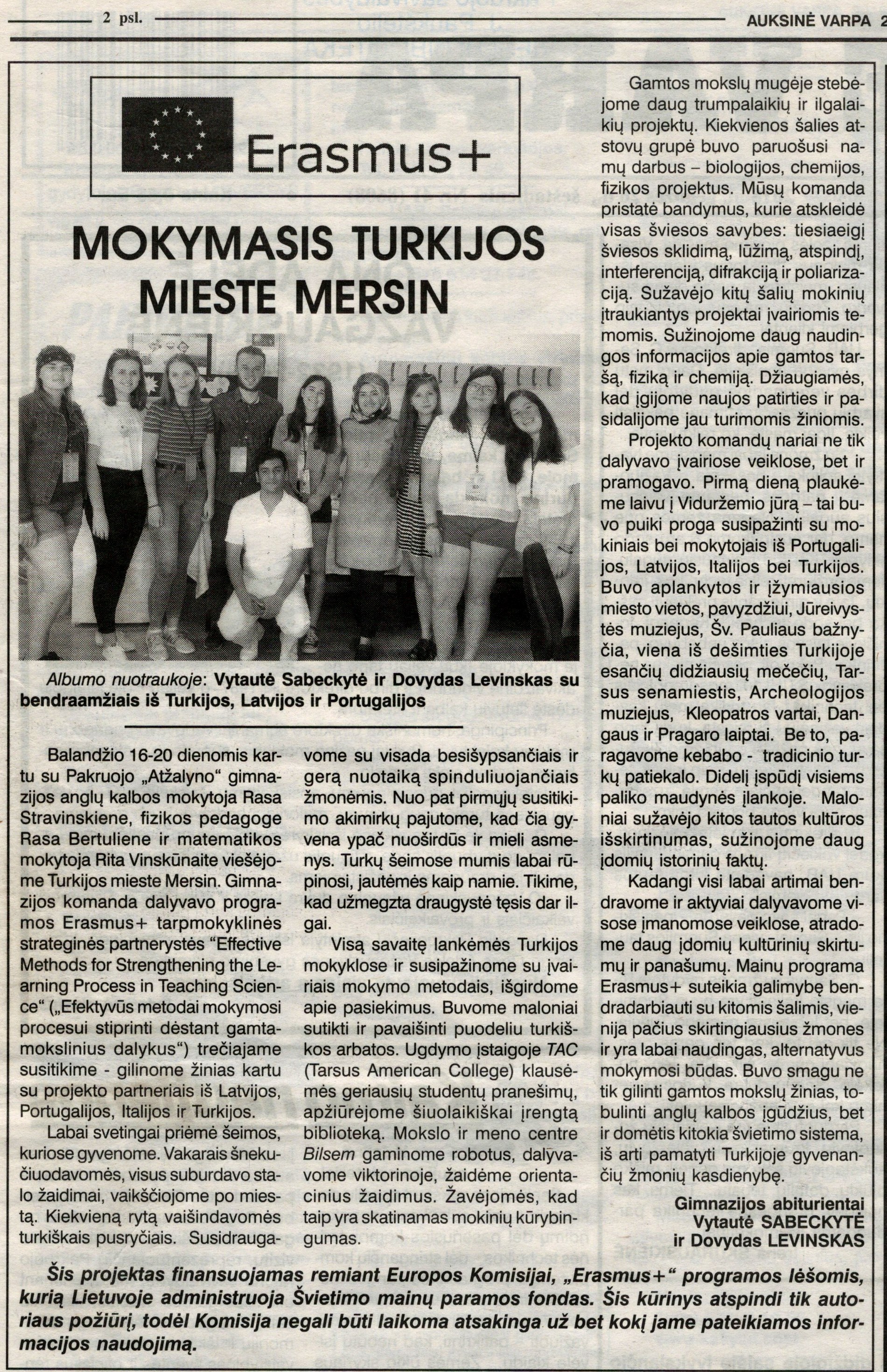 Pakruojo „Atžalyno“ gimnazijos anglų kalbos mokytoja Rasa Stravinskienė, fizikos pedagogė Rasa Bertulienė ir matematikos vingrybių mokanti Rita Vinskūnaitė bei gimnazistai Dovydas Levinskas (IVb) ir Vytautė Sabeckytė (IVa) 2018 m. balandžio 16-20 dienomis viešėjo Turkijos mieste Mersin. Gimnazijos komanda dalyvavo programos Erasmus+ tarpmokyklinės strateginės partnerystės “Effective Methods for Strengthening the Learning Process in Teaching Science“ („Efektyvūs metodai mokymosi procesui stiprinti dėstant gamtamokslinius dalykus“) trečiajame susitikime. Lietuvos atstovai gilino žinias kartu su projekto partneriais iš Latvijos, Portugalijos, Italijos ir Turkijos.