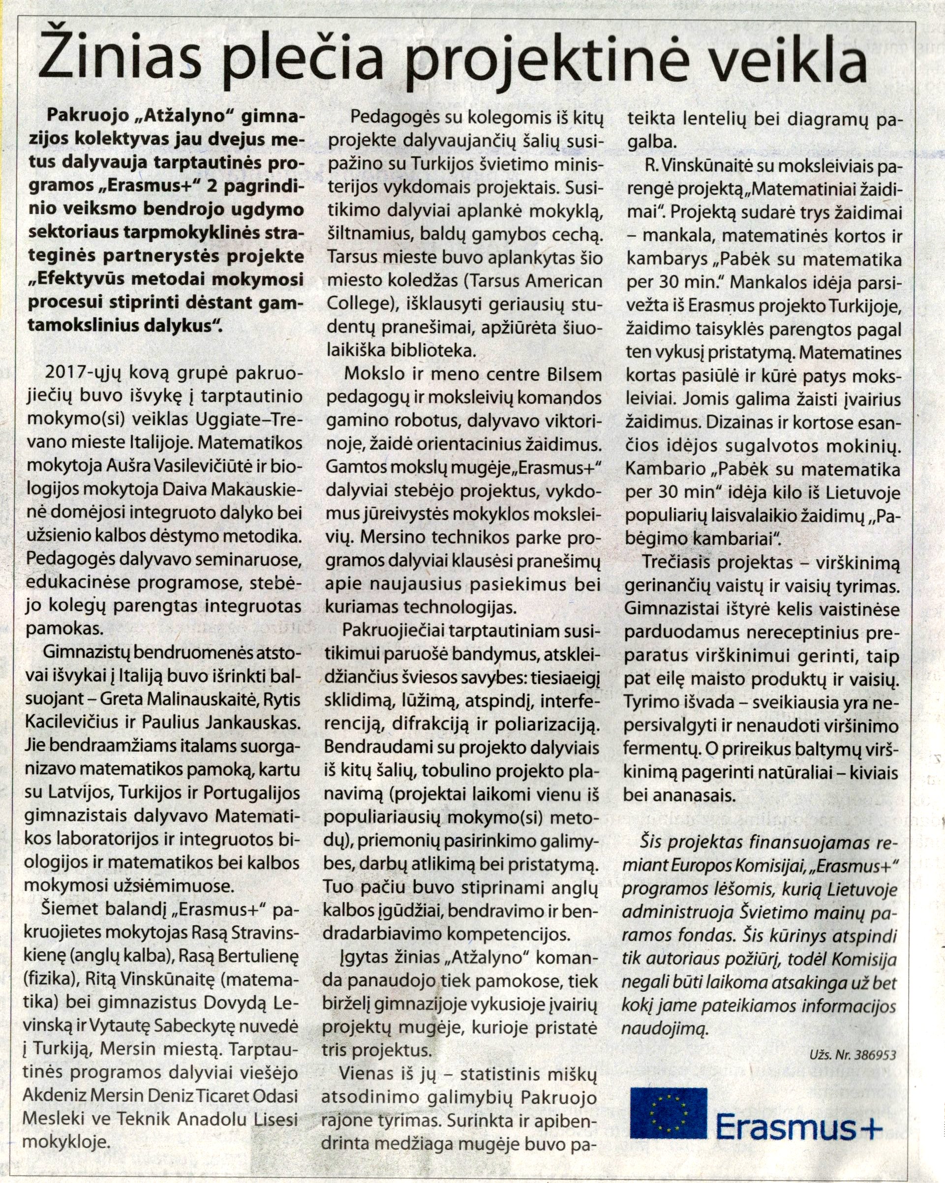 2018 m. birželio 12 dieną „Atžalyno“ gimnazijoje vyko rajoninė gamtos mokslų konferencija-mugė. Jos metu buvo pristatyti programos Erasmus+ tarpmokyklinės strateginės partnerystės “Effective Methods for Strengthening the Learning Process in Teaching Science“ („Efektyvūs metodai mokymosi procesui stiprinti dėstant gamtamokslinius dalykus“) metu įgyvendintos veiklos, pristatyti rezultatai ir produktai. Tarptautinio projekto dalyvės mokytojos R. Vinskūnaitė, A. Vasilevičiūtė, D. Stočkūnienė, D. Makauskienė, A. Petrulaitienė skaitė pranešimus apie tarptautinio projekto naudą bei įtaką organizuojant ugdymo procesą gimnazijoje.