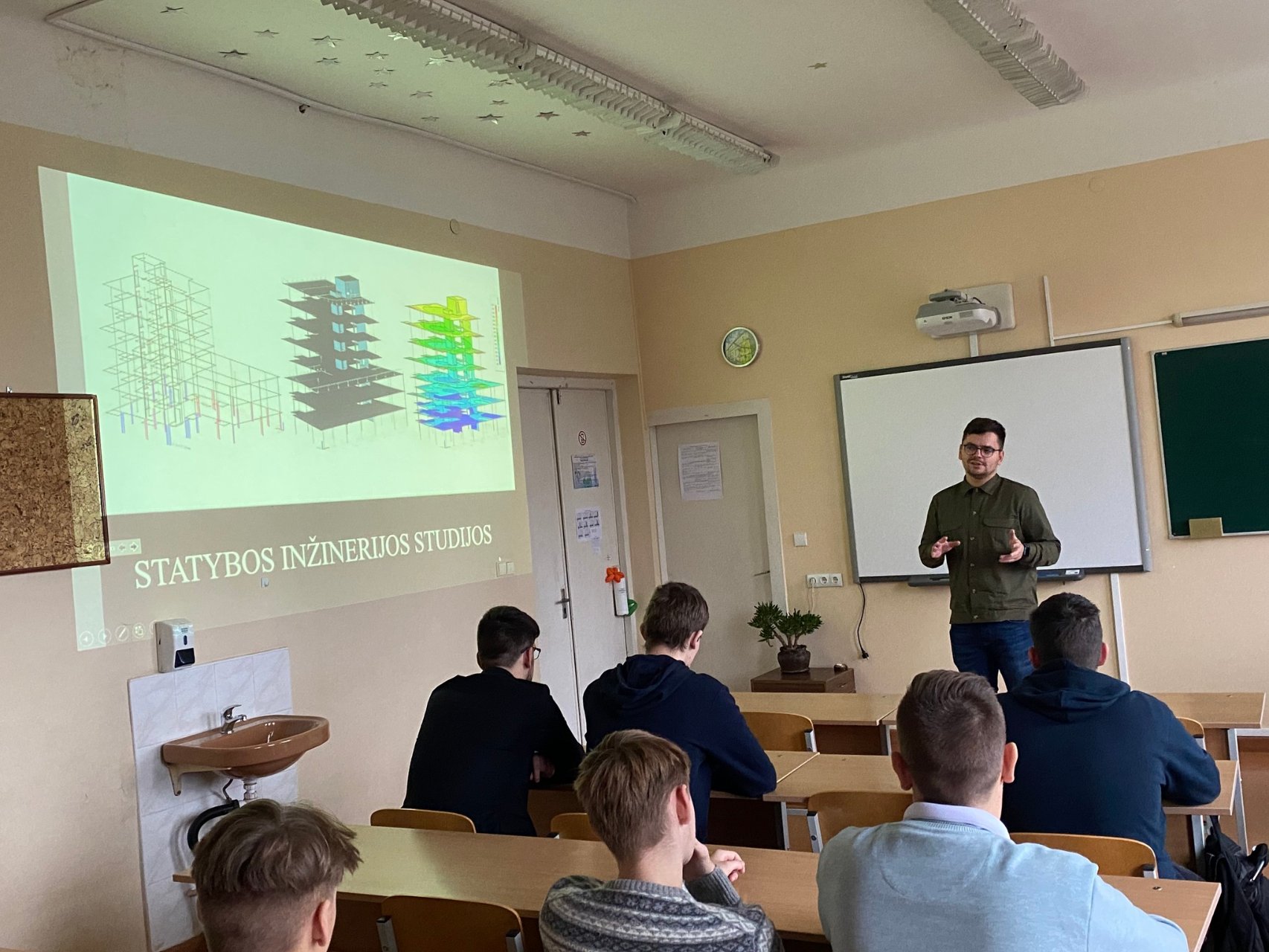 Nekilnojamo turto plėtros bendrovės BOLDS statybos projektų vadovas VALDAS JURYS pasakojo, su kokiais iššūkiais susiduria kasdienybėje. Mokiniams buvo smalsu išvysti, kokius pastatus yra pastatęs.