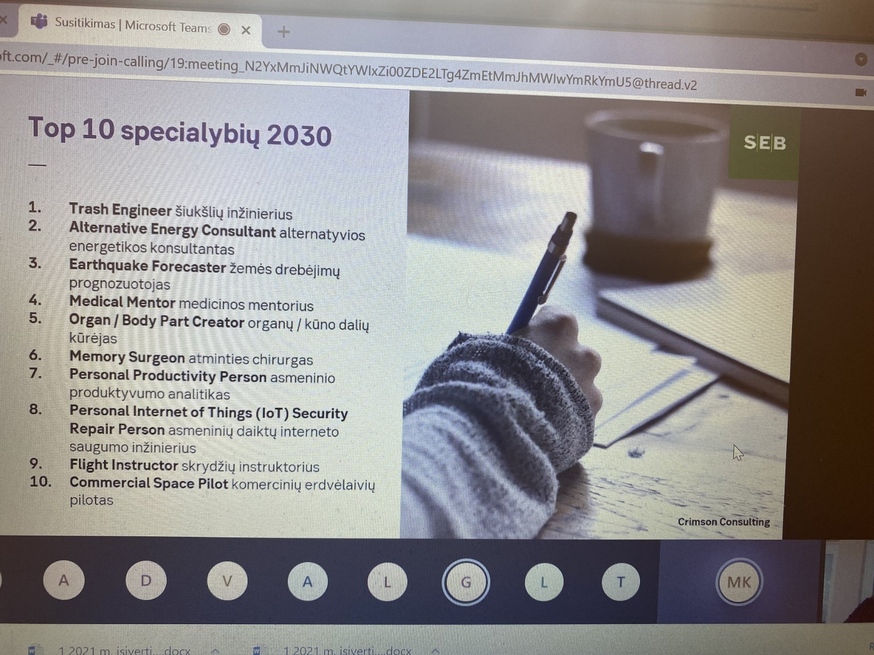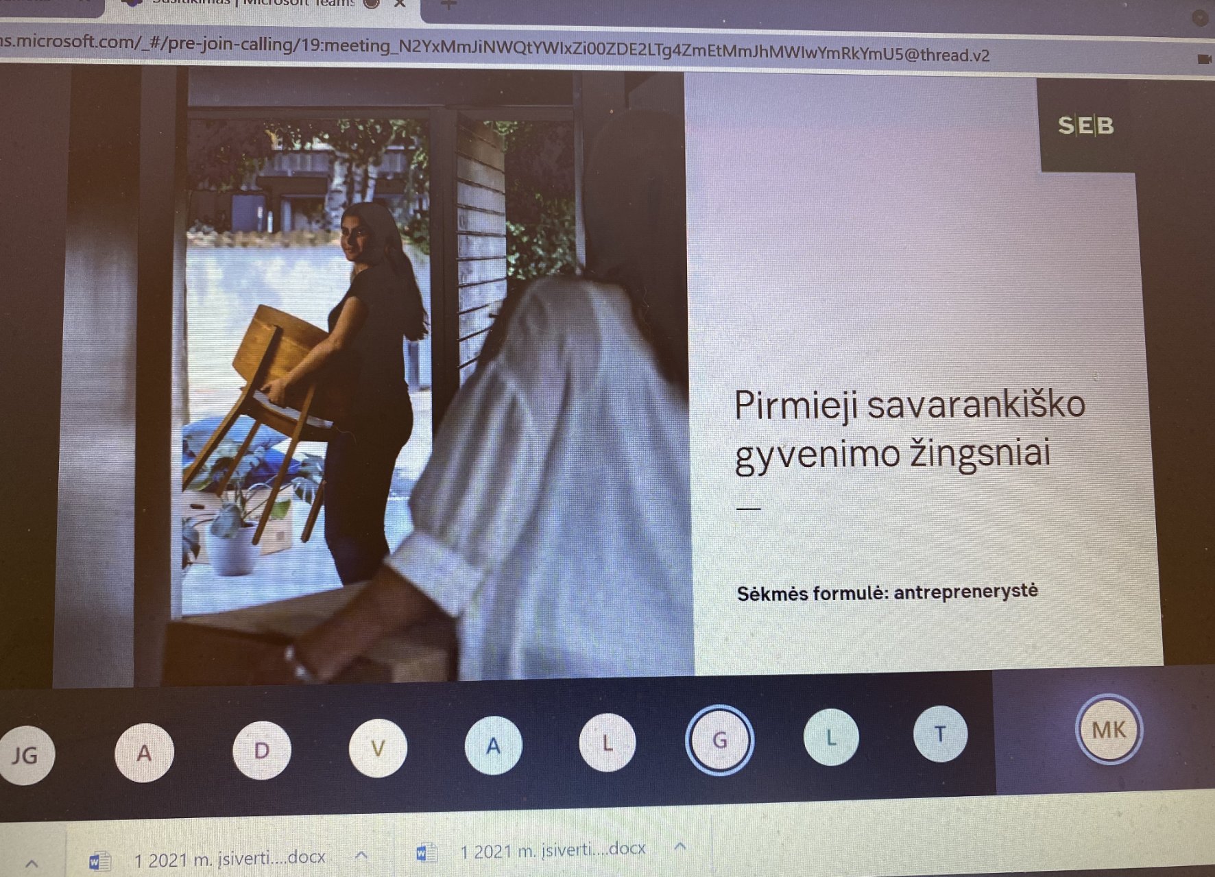 II b klasės gimnazistai ir auklėtoja Roma Juknevičienė dalyvavo SEB banko organizuotoje nuotolinėje finansinio raštingumo pamokoje „Pirmieji savarankiško gyvenimo žingsniai“. Megos ir Santakos skyrių vadovė Monika Kušlienė kalbėjo apie išsilavinimą, jo svarbą ir ateities profesijas. Gimnazistai buvo supažindinti su antreprenerystės sąvoka ir savybėmis, kurios reikalingos šiandien žmogui, norinčiam būti sėkmingam.