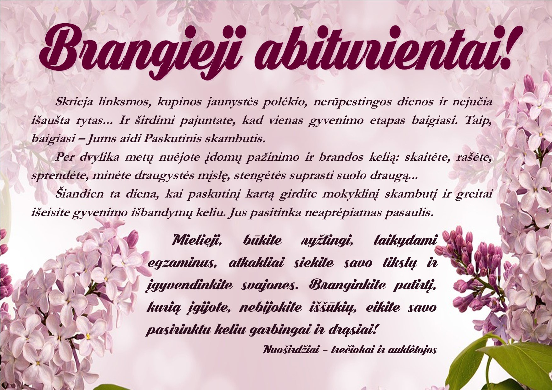 Trečiokų atstovai ant tilto pasitiko abiturientus ir įteikė varpelius. Renginys vyko mokyklos kiemelyje. Skambindami varpeliais, mūsų abiturientai išdidžiai žengė pro mokyklos vartus – bendruomenė pasitiko plojimais, dovanojo šypsenas, baltais žiedais apsupo žydintis sodas. Gražūs žodžiai, muzika, dainos, linkėjimai glostė ketvirtokų širdis ir vis priminė - tuoj finišas. Sveikinimo žodį tarė direktoriaus pavaduotoja ugdymui, atliekanti direktoriaus funkcijas Rasa Bertulienė ir kartu su direktoriaus pavaduotoja ugdymui Rasa Augustinaitiene abiturientams įteikė padėkos raštus už aktyvią visuomeninę, sportinę, meninę veiklą, liaudies šokio puoselėjimą, žurnalistikos idėjų sklaidą, olimpiadose užimtas prizines vietas. Muzikinį kūrinį visiems dovanojo I b klasės gimnazistas Kajus Zaičenko, akordeonu pagrojęs kūrinį „Karamelinis aukcionas“. Nebijoti iššūkių ir tikėti savimi abiturientus kvietė gimnazijos mokinių prezidentė, III c klasės mokinė Sandra Jurytė. Dainomis „Dar širdyje ne sutema“ ir „Lauk manęs“ šventę papuošė kvartetas, kuriam akomponavo mokytoja Rūta Venslovienė. Abiturientams grojo ir mokinių grupė „Melas“, skambėjo daina „Paleisk mane namo“, ją atliko III c klasės gimnazistė Justina Dievelytė. Renginio pabaigoje abiturientų atstovė Gabrielė Misius simbolinį mokyklos raktą perdavė trečiokams.